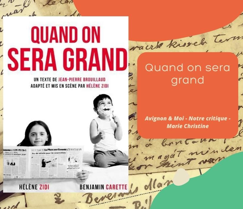 Au théâtre du Roi René, Helene Zidi et Benjamin Carette, nous proposent une adaptation d’un texte de Jean pierre Bouillaud, ayant pour titre : Quand on sera grand. Il s’agit, bien sûr, d'enfance, à savoir comment nous survivons à celle-ci dans le temps.